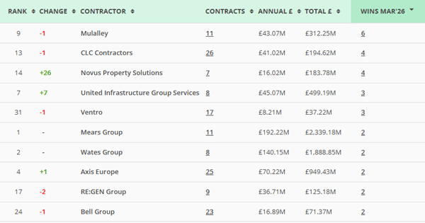 Mulalley and Hugh L S McConnell maintain steady presence, reflecting long-term programme delivery rather than new wins.