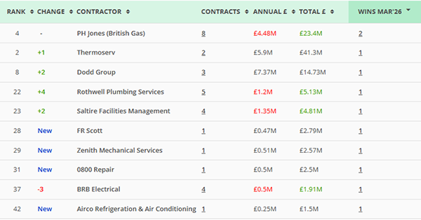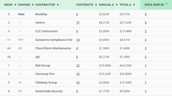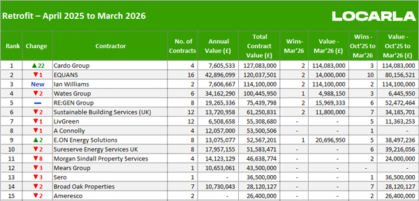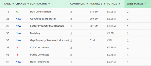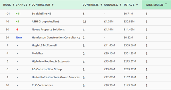 Along with our main monthly league tables, ❲see below❳, we also produce tables based on the following trades: Retrofit, Asbestos Survey, Fire Risk Assessment, Water/Legionella & Stock Condition Survey. ❲Premium Clients, click here for the PDF