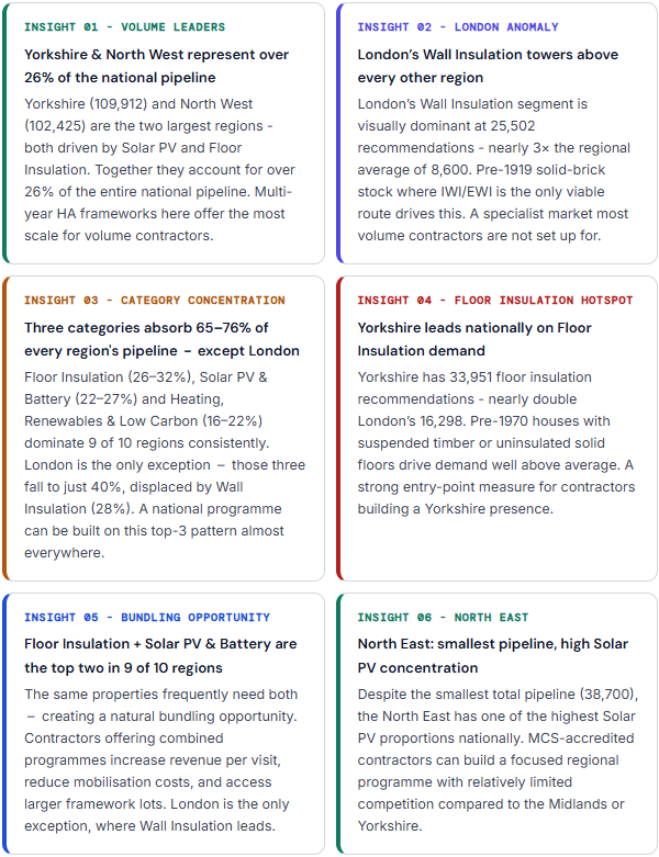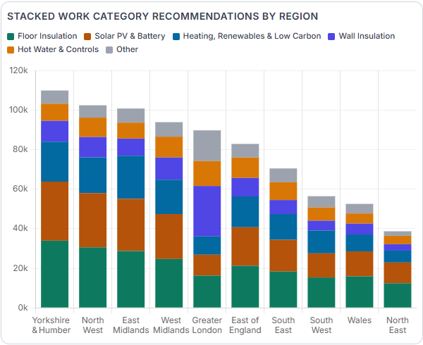 The chart below shows how improvement recommendations are distributed across England and Wales. While Yorkshire and the North West carry the largest overall pipelines, the structure of that demand is consistent: floor insulation and solar PV appear most frequently, often on the same properties.