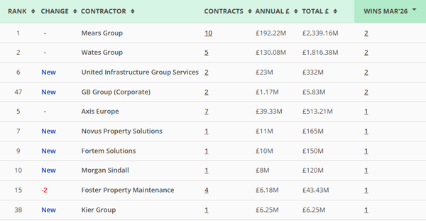 Mears Group and Wates Group continue to anchor the sector, combining scale with repeat frameworks.