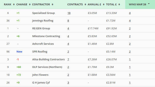 Specialised Group and Jennings Roofing lead in volume of wins rather than value.