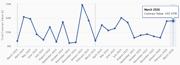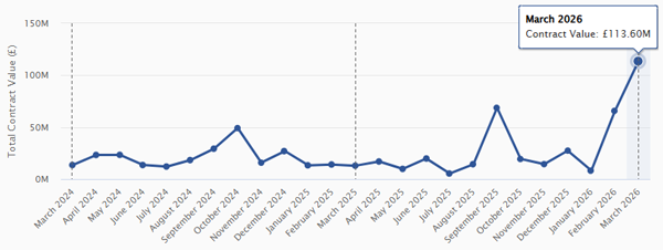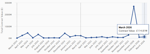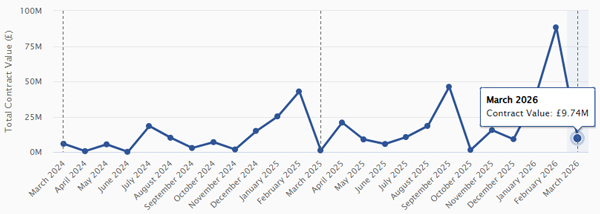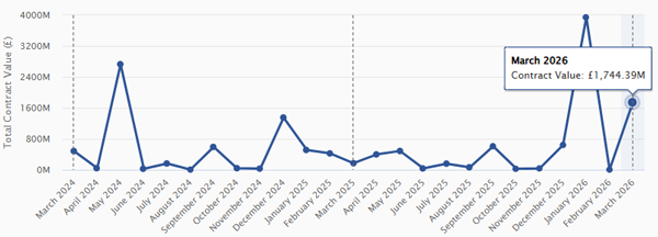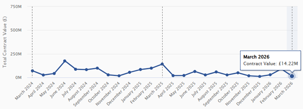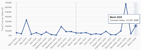 March shows a highly uneven distribution of contract value, driven by a small number of large awards rather than broad market activity. Total value reached £2.04bn, but this sits alongside relatively modest activity across several core workstreams.