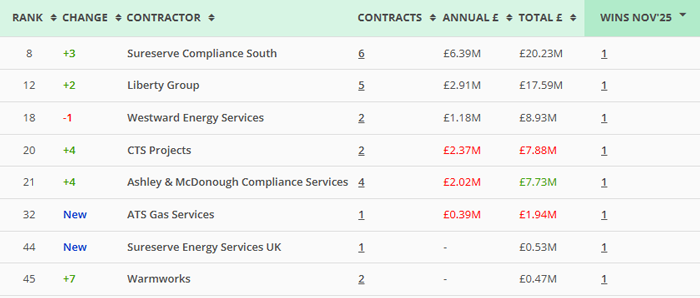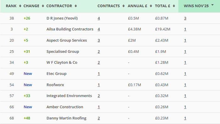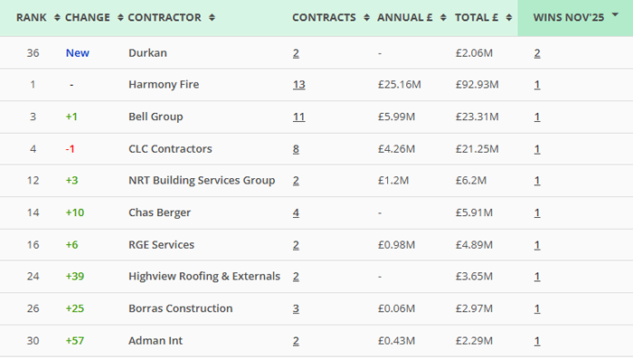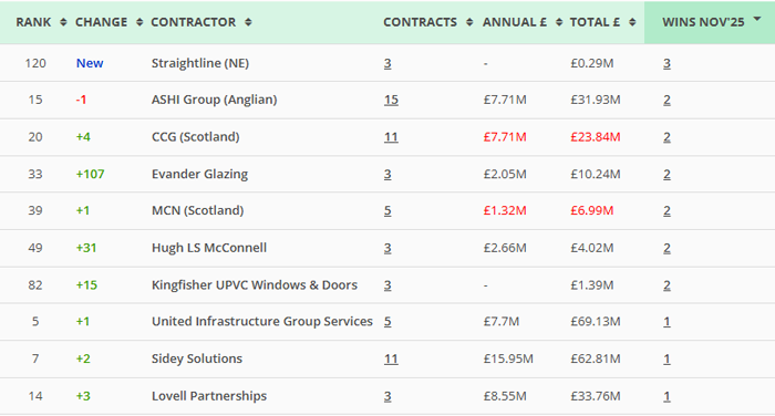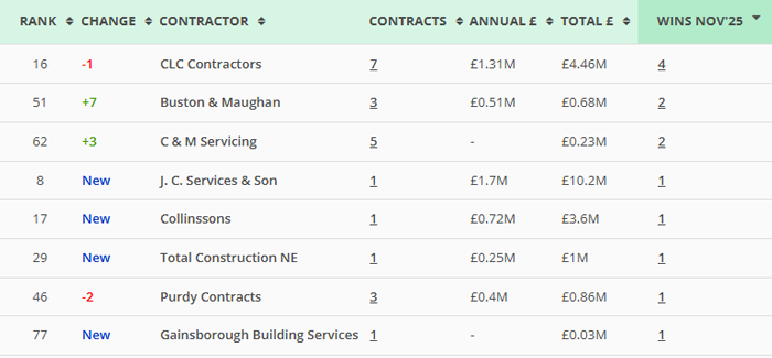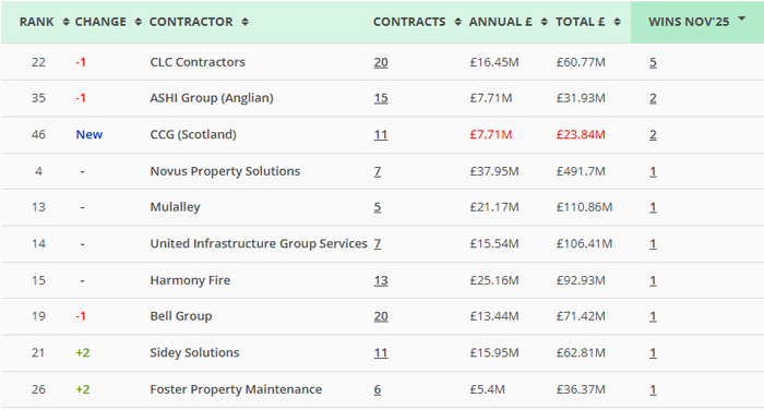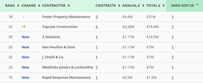Along with our main monthly league tables, ❲see below❳, we also produce tables based on the following trades: Retrofit, Asbestos Survey, Fire Risk Assessment, Water/Legionella & Stock Condition Survey. ❲Premium Clients, click here for the PDF