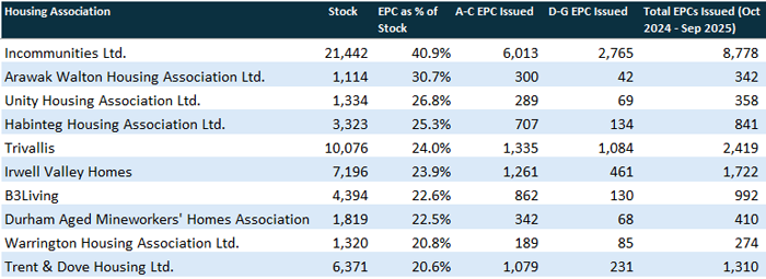 EPC Rating Breakdown for Housing Associations Issuing the Most EPCs