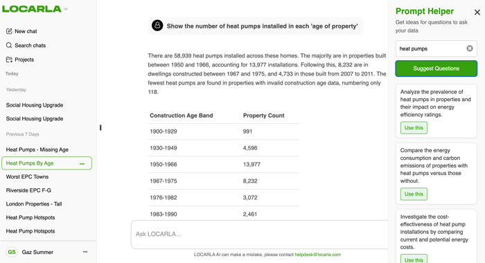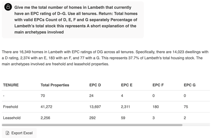 Given that we have the latest EPC Q3 analysis in this month’s Briefing, it seems timely that today we’re launching our latest work. The result of two years hard labour: a tool that lets you talk to Locarla Properties, our national property and EPC datasets. Ask a question and get a precise, data-driven answer in seconds (sometimes a bit longer). More on that below.