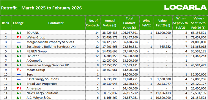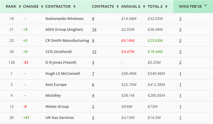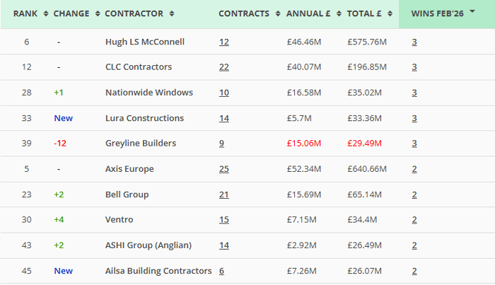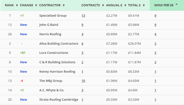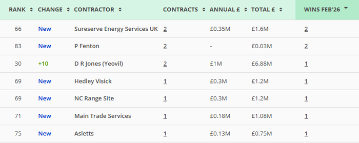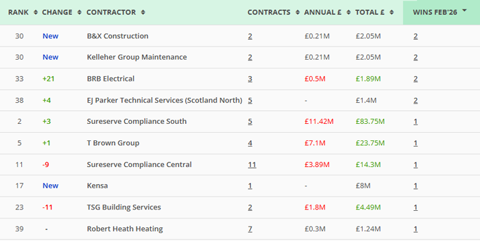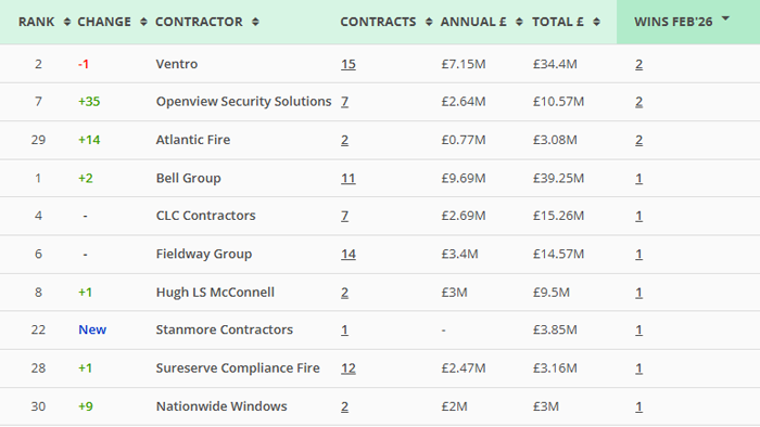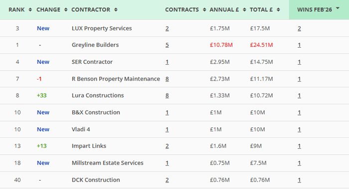 Along with our main monthly league tables, ❲see below❳, we also produce tables based on the following trades: Retrofit, Asbestos Survey, Fire Risk Assessment, Water/Legionella & Stock Condition Survey. ❲RMI Insight & Decarbonisation clients, click here for the PDF